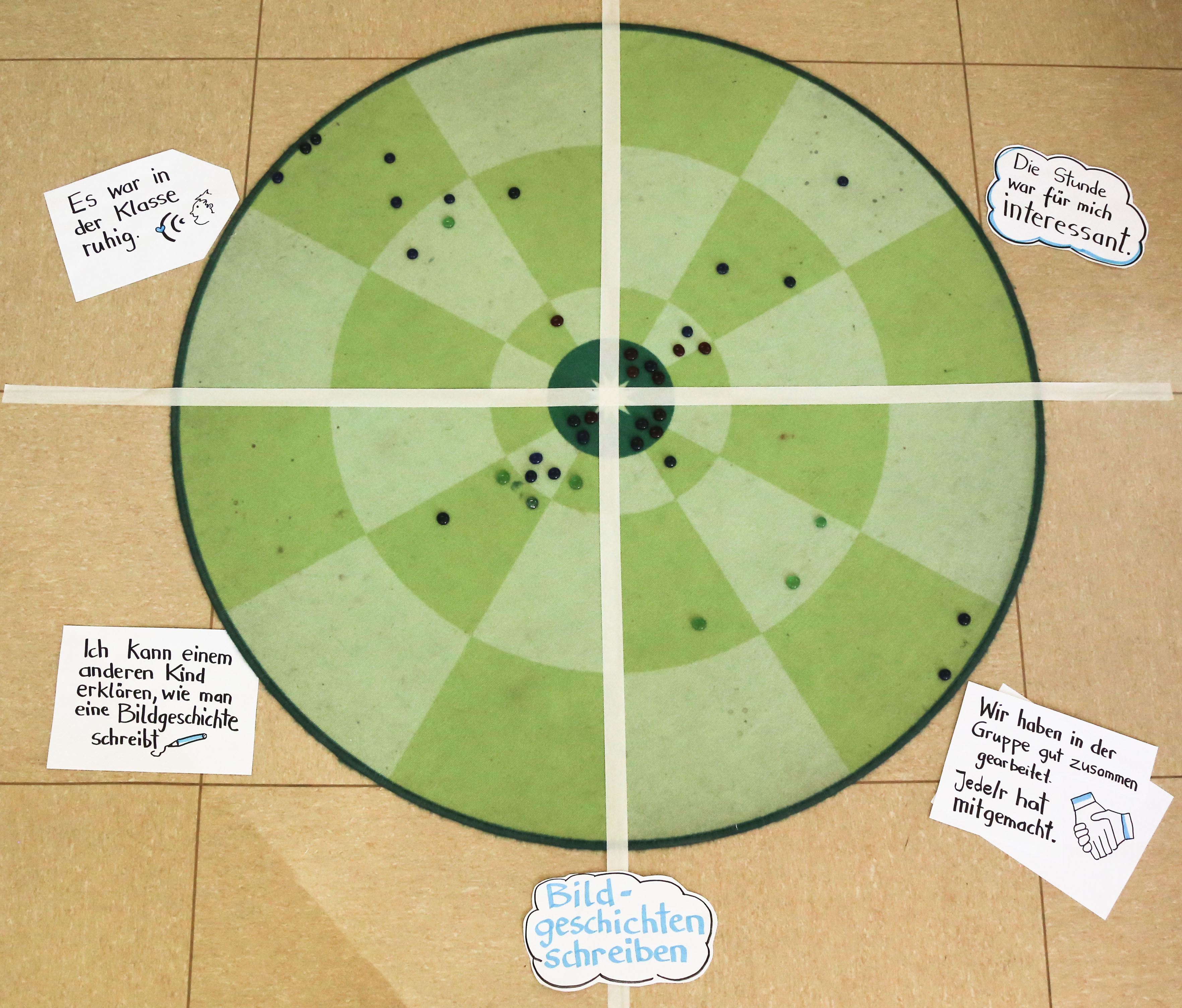 Varianten: Alternativ dazu kann die Zielscheibe auch mit Malerkrepp im Sitzkreis auf den Boden geklebt werden oder es kann ein Lernteppich genutzt werden. Die Lernenden können ihre Rückmeldung dann mit Glasnuggets geben (zur Dokumentation fotografieren, siehe Beispielfoto).